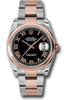 36mm stainless steel case, 18K pink gold domed bezel, black dial, Roman numerals, and stainless steel and 18K pink gold Oyster bracelet.