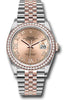 36mm Everose Rolesor case with Oystersteel monobloc middle case, screw-down steel back, screw-down 18K Everose crown, 18K Everose diamond bezel, rose dial, Roman numerals with diamond set 6 and 9, Rolex calibre 3235 self-winding movement with date at 3 o'clock, approximately 70 hours of power reserve, Everose Rolesor Jubilee bracelet with five-piece links, folding Oysterclasp buckle with Easylink 5mm comfort extension link. Waterproof to 100 meters. Redesigned for Baselworld 2018 with updated case sides, lugs, and calibre 3235 movement.