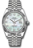 41mm white Rolesor case comprised of a 904L steel monobloc middle case, screw-down steel back, screw-down crown with twinlock double waterproofness system, 18K white gold fluted bezel, scratch-resistant double anti-reflective sapphire crystal with cyclops lens over the date, white mother-of-pearl dial, 10 diamond hour markers, Rolex calibre 3235 perpetual self-winding movement with date at 3 o'clock that changes instantaneously at midnight in a few thousandths of a second, approximately 70 hours of power reserve, 904L steel Jubilee bracelet with five-piece links, folding Oysterclasp buckle with Easylink 5mm comfort extension link. Waterproof to 100 meters.