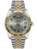 DESCRIPTION: Rolex Oyster Perpetual Datejust 41 Watch 126303 slgrj 41mm Yellow Rolesor case with 904L steel monobloc middle case, screw-down steel back, 18K yellow gold screw-down crown, 18K yellow gold smooth bezel, scratch-resistant double anti-reflective sapphire crystal with cyclops lens over the date, slate dial, green Roman numerals, Rolex calibre 3235 perpetual self-winding movement with date at 3 o'clock that changes instantaneously at midnight in a few thousandths of a second, approximately 70 hours of power reserve, yellow Rolesor Jubilee bracelet made from a combination of 904L steel and 18K yellow gold with five-piece links, folding Oysterclasp buckle with Easylink 5mm comfort extension link. Waterproof to 100 meters.