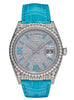 This Rolex Day-Date is designed in a 36mm white gold case set entirely with diamonds. The dial is pave diamond set with turquoise Roman numerals. This watch comes on a turquoise leather strap.