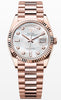 The Oyster Perpetual Day-Date 36 in 18 kt Everose gold with a white mother-of-pearl, diamond-set dial, fluted bezel and a President bracelet.