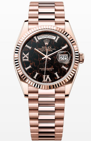 The Oyster Perpetual Day-Date 36 in 18 kt Everose gold with an Eisenkiesel, diamond-set dial, fluted bezel and a President bracelet.