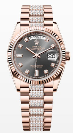 The Oyster Perpetual Day-Date 36 in 18 kt Everose gold with a slate, diamond-set dial, fluted bezel and a diamond-set President bracelet.
