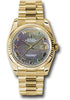 36mm 18K yellow gold case, fluted bezel, dark mother of pearl dial, Roman numerals, and President bracelet.