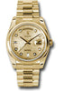36mm 18K yellow gold case, domed bezel, champagne jubilee dial, 8 round and 2 baguette diamond hour markers, and President bracelet.