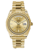 DESCRIPTION: Rolex Oyster Perpetual Day-Date 40 Watch 228238 chip 40mm 18K yellow gold case, screw-down back with Rolex fluting, screw-down crown with twinlock double waterproofness system, fluted bezel, scratch-resistant double anti-reflective sapphire crystal with cyclops lens over the date, champagne dial, index hour markers with Chromalight, Rolex calibre 3255 automatic movement with centre hour, minute and seconds hands, instantaneous day and date in apertures, unrestricted rapid-setting, and stop-seconds for precise time setting, approximately 70 hours of power reserve, President bracelet with three-piece solid links comprised of a polished center link, satin-finished outer links, and ceramic inserts, concealed folding Crownclasp buckle. Waterproof to 100 meters.