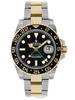 40mm stainless steel case, black 24 hour 18K yellow gold bezel, green 24 hour hand, independent 12 hour hand, black dial, and stainless steel and 18K yellow gold Oyster Fliplock bracelet.