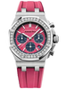 Audemars Piguet Royal Oak Offshore Selfwinding Chronograph Watch 37 mm stainless steel case, 12.4 mm thick, glareproofed sapphire crystal back, screw-locked crown, diamond-set bezel with 32 brilliant-cut diamonds (~1.02 carats), glareproofed sapphire crystal, pink dial with Lady Tapisserie pattern, blue counters, blue external zone, white gold applied hour-markers and Royal Oak hands with luminescent coating, Calibre 2385 selfwinding movement with chronograph, hours, minutes, small seconds and date, approximately 40 hours of power reserve, pink rubber strap, stainless steel AP folding buckle. Water resistant to 50 meters.