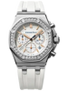 Audemars Piguet Royal Oak Offshore Chronograph Summer Edition 2017 Watch 37 mm stainless steel case, 12.35 mm thick, screw-locked crown, diamond-set bezel, silver-toned dial with Lady Tapisserie pattern, silver-toned counters, pink gold applied hour-markers and Royal Oak hands with luminescent coating, Calibre 2385 selfwinding movement with chronograph, hours, minutes, small seconds and date, approximately 40 hours of power reserve, white rubber strap, stainless steel AP folding buckle , comes with additional blue rubber strap. Water resistant to 50 m.