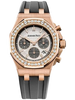 Audemars Piguet Royal Oak Offshore Selfwinding Chronograph Watch 18K pink gold case, 37 mm thick, screw-locked crown, diamond-set bezel with 32 brilliant-cut diamonds (~1.02 carats), glareproofed sapphire crystal, silver-toned dial with Lady Tapisserie pattern, grey ruthenium-toned counters, grey ruthenium-toned external zone, pink gold applied hour-markers and Royal Oak hands with luminescent coating, Calibre 2385 selfwinding movement with chronograph, hours, minutes, small seconds and date, approximately 40 hours of power reserve, grey rubber strap, 18K pink gold AP folding buckle. Water resistant to 50 meters.