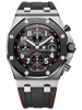 Audemars Piguet Royal Oak Offshore Selfwinding Chronograph Watch 42 mm stainless steel case, 14.6 mm thick, glareproofed sapphire crystal back, black ceramic pushpieces and screw-locked crown, black ceramic bezel, glareproofed sapphire crystal, black dial with Méga Tapisserie pattern, black counters, Arabic numerals with luminescent coating, white gold Royal Oak hands with luminescent coating, Calibre 3126/3840 selfwinding movement with chronograph, hours, minutes, small seconds, date, approximately 50 hours of power reserve, two-ton black and red rubber strap, stainless steel pin buckle. Water resistant to 100 meters.