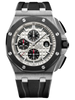 Selfwinding chronograph with date display and small seconds at 12 o'clock. Stainless steel case, silvered and black dial, black strap. Stainless steel case, glareproofed sapphire crystal and caseback, black ceramic bezel, screw-locked crown and pushpieces, stainless steel pushpiece guards. Silver-toned dial with “Méga Tapisserie” pattern, black counters, gold applied hour-markers and gold Royal Oak hands with luminescent coating, silver-toned inner bezel ring.