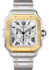 Cartier Santos de Cartier Chronograph Watch 43.3 mm gold and stainless steel case, 12.5 mm thick, 7-sided crown set with a faceted blue synthetic spinel, sapphire crystal, satin-brushed silver dial, caliber 1904 CH MC automatic movement, steel bracelet with SmartLink adjustment system, steel folding buckle. Water resistant to 10 bar (approx. 100 meters).