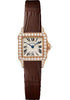 24mm x 18.7mm 18K pink gold case set with 48 brilliant cut diamonds, 5.5mm thick, octagonal shaped crown set with a cut diamond totalling 0.37 carats, sapphire crystal, silver dial with blued steel-sword shaped hands, quartz movement, brown alligator skin strap, 18K pink gold ardillon buckle. Water resistant to 30 meters.