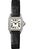 24mm x 18.7mm 18K white gold case with rhodium-finish and set with 48 brilliant cut diamonds, 5.5mm thick, octagonal shaped crown set with a cut diamond totalling 0.37 carats, sapphire crystal, silver dial with blued steel-sword shaped hands, quartz movement, black alligator skin strap, 18K white gold ardilon buckle. Water resistant to 30 meters.