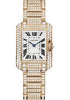 Small size (30.2mm x 22.7mm) 18K pink gold case set with brilliant-cut diamonds, nine-sided crown set with a brilliant-cut diamond, sapphire crystal, slivered and lacquered flinqué dial with Roman numerals and sword-shaped blued-steel hands, quartz caliber Cartier 057 movement, 18K pink gold bracelet set with brilliant-cut diamonds. Water resistant to 30 meters.