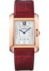 34.7mm x 26.2mm 18K pink gold case set with 11 brilliant-cut diamonds, 7.1mm thick, sapphire back, 9-sided crown set with a brilliant-cut diamond, 18K pink gold bezel set with a brilliant-cut diamonds, sapphire crystal, silver dial set with brilliant-cut diamonds, quartz movement with blued-steel sword-shaped hands, bordeaux alligator skin strap. Water resistant to 3 bar.