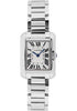 Small size (30.2mm x 22.7mm) rhodiumized 18K white gold case, nine-sided crown set with a sapphire, sapphire crystal, slivered and lacquered flinqué dial with Roman numerals and sword-shaped blued-steel hands, quartz caliber Cartier 057 movement, rhodiumized 18K white gold bracelet. Water resistant to 30 meters.