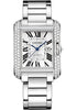Medium size (39.2mm x 29.8mm) rhodiumized 18K white gold case set with brilliant-cut diamonds, nine-sided crown set with a brilliant-cut diamond, sapphire crystal, slivered and lacquered flinqué dial with Roman numerals and sword-shaped blued-steel hands, self-winding caliber Cartier 077 movement, rhodiumized 18K white gold bracelet. Water resistant to 30 meters.