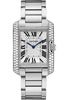 34.7mm x 26.2mm 18K white gold case set with brilliant-cut diamonds, 7.1mm thick, 9-sided crown set with a brilliant-cut diamond, 18K white gold bezel set with a brilliant-cut diamonds, silver dial set with brilliant-cut diamonds, quartz movement with blued-steel sword-shaped hands, 18K white gold bracelet. Water resistant to 3 bar.