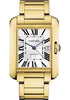 Large size (47mm x 36.2mm) 18K yellow gold case, transparent sapphire crystal back, nine-sided crown set with a sapphire, sapphire crystal, slivered and lacquered flinqué dial with Roman numerals and sword-shaped blued-steel hands, self-winding caliber Cartier 1904MC movement, 18K yellow gold bracelet. Water resistant to 30 meters.
