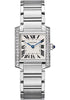 30mm x 25.05mm steel case with 26 brilliant-cut diamonds totalling 0.62 carats, 6.65mm thick, faceted crown with a synthetic cabochon-shaped spinel, sapphire crystal, silvered dial with blued steel sword-shaped hands, quartz movement, steel bracelet, steel folding buckle. Water resistant to 30 meters.
