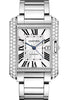 Large size (47mm x 36.2mm) rhodiumized 18K white gold case set with brilliant-cut diamonds, transparent sapphire crystal back, nine-sided crown set with a brilliant-cut diamond, sapphire crystal, slivered and lacquered flinqué dial with Roman numerals and sword-shaped blued-steel hands, self-winding caliber Cartier 1904MC movement, rhodiumized 18K white gold bracelet. Water resistant to 30 meters.