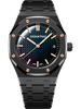 Rainbow-coloured sapphire dial with polished mirror effect showcasing the Tapisserie geometry, pink gold Royal Oak hour-markers and hands. |