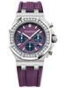 Audemars Piguet Royal Oak Offshore Selfwinding Chronograph Watch 37 mm stainless steel case, 12.4 mm thick, stainless steel pushpieces and screw-locked crown, diamond-set bezel, pink dial with Lady Tapisserie pattern, blue counters, blue external zone, white gold applied hour-markers and Royal Oak hands with luminescent coating, Calibre 2385 selfwinding movement with chronograph, hours, minutes, small seconds and date, approximately 40 hours of power reserve, purple rubber strap, stainless steel AP folding buckle , comes with additional blue rubber strap. Water resistant to 50 m.