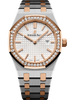 Silver-toned dial with “Grande Tapisserie” pattern, pink gold applied hourmarkers and Royal Oak hands with luminescent coating. |