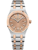 33mm stainless steel case, 7mm thick, 18K pink gold crown, 18K pink gold bezel, glareproofed sapphire crystal, pink gold-toned dial with “Grande Tapisserie” pattern, white gold applied hour-markers and Royal Oak hands with luminescent coating, Calibre 2713 quartz movement with hours, minutes, date, stainless steel and 18K pink gold bracelet, AP folding buckle. Water resistant to 50 meters.