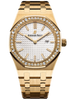 The glow of gold in the new Royal Oak Quartz 33 mm edition is accentuated by the glittering 40 brilliant-cut diamonds (0.73 carats) on the bezel and the “Grande Tapisserie” pattern on the silver or the new blue dial. Additional signature codes are also in place: 18-carat yellow gold case, yellow gold applied hour-markers and Royal Oak hands with luminescent coating. 18-carat yellow gold case, glareproofed sapphire crystal, diamond-set bezel, water-resistant to 50 m. Silver-toned or blue dial with “Grande Tapisserie” pattern, yellow gold applied hour-markers and Royal Oak hands with luminescent coating. 18-carat yellow gold bracelet with AP folding clasp.