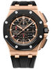 Audemars Piguet Royal Oak Offshore Chronograph Watch 44 mm 18K pink gold case, 14.4 mm thick, glareproofed sapphire crystal back, screw-locked crown and pushpieces with pink gold pushpiece guards, black ceramic bezel, glareproofed sapphire crystal, black dial with Méga Tapisserie” pattern, black counters, pink gold applied hour-markers and Royal Oak hands with luminescent coating, black inner bezel, Calibre 3126 / 3840 Manufacture selfwinding movement with chronograph, hours, minutes, small seconds, date, approximately 50 hours of power reserve, black rubber strap, 18K pink gold pin buckle. Water resistant to 100 meters.