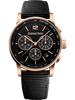The selfwinding chronograph’s black lacquered dial offers a perfect mirror finish. The 18-carat pink gold case echoes the curved gold indexes and singular numeral at 12 o’clock.