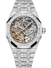 Rhodium-toned openworked dial, pink gold applied hourmarkers and Royal Oak hands with luminescent coating. |