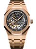 Slate grey openworked dial, pink gold applied hour-markers and Royal Oak hands with luminescent coating. |