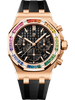 Baguette-cut rainbow gemstones provide a sparkling and colourful frame for this Royal Oak Offshore model in pink gold with a new black "Lady Tapisserie" dial.