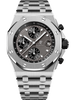 Grey dial with “Petite Tapisserie” pattern, black counters, white gold applied hour-markers and Royal Oak hands with luminescent coating, black inner bezel. |