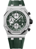 Khaki green dial with “Mega Tapisserie” pattern, silver-toned counters, arabic numerals hour-markers and white gold Royal Oak hands with luminescent coating, khaki green inner bezel. |