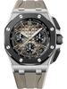 Smoked light brown dial with “Méga Tapisserie” pattern, black counters and external zone, white gold applied hour-markers, white gold Royal Oak hands with luminescent coating, black inner bezel |