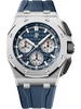 Blue dial with “Méga Tapisserie” pattern, rhodium-toned counters and external zone, white gold applied hour-markers and Royal Oak hands with luminescent coating, blue inner bezel |