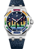 This 37 mm white gold Royal Oak Offshore Selfwinding blends avant-garde gemsetting with a design inspired by music. The pioneering harmony-cut coloured gemstones adorning the blue aventurine dial evoke a VU meter, while echoing the gemset bezel. The blue textured interchangeable rubber strap adds a refined touch.