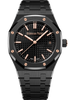 Black dial with “Grande Tapisserie” pattern, pink gold applied hour-markers and Royal Oak hands with luminescent coating. |