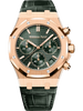 Khaki green dial with “Grande Tapisserie” pattern, green counters, pink gold applied hour-markers and Royal Oak hands with luminescent coating.