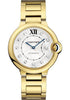 Medium size (36.6mm) 18K yellow gold case, fluted crown with a blue sapphire cabochon, silvered and lacquered sunray flinqué dial with 11 round diamond hour markers and 1 black Roman numeral, automatic winding Cartier caliber 076 movement, 18K yellow gold bracelet. Water resistant to 30 meters.