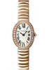 Mini size (25.30mm x 20.795mm) 18K pink gold case set with round diamonds, twelve-sided crown set with a diamond, sapphire crystal, silvered sunray finish dial with Roman numerals and sword-shaped blued-steel hands, quartz caliber 059 movement, 18K pink gold bracelet. Water resistant to 30 meters.