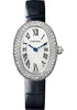 32 mm x 26 mm rhodiumized white gold case set with brilliant-cut diamonds, 18K white gold beaded crown set with a brilliant-cut diamond, sapphire crystal, silver dial, quartz movement, navy blue strap, rhodiumized 18K white gold ardillon buckle. Water resistant to 3 bar (approx. 30 meters/100 feet).