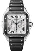 Cartier Santos de Cartier Chronograph Watch 43.3 mm stainless steel and ADLC case, 12.5 mm thick, 7-sided crown set with a faceted black synthetic spinel, sapphire crystal, satin-brushed silver dial, caliber 1904 CH MC automatic movement, both bracelet, steel folding buckle. Water resistant to 10 bar (approx. 100 meters).