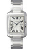 Medium size (39.2mm x 29.8mm) stainless steel case, nine-sided crown set with a synthetic spinel cabochon, sapphire crystal, flinqué and silvered dial with Roman numerals and blued steel sword-shaped blued-steel hands, self-winding caliber Cartier 077 movement with calendar aperture at 3 o'clock, polished stainless steel bracelet with satin-finished central links. Water resistant to 30 meters.
